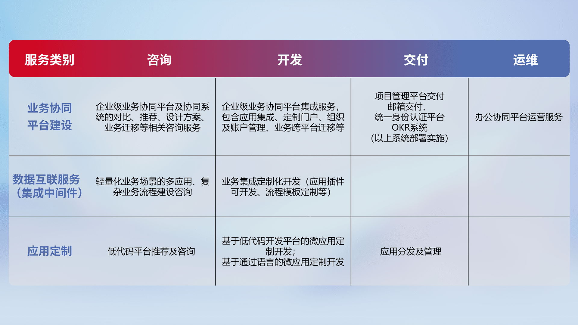 针对钉钉、、、企微、、、、IDaas等平台级产品提供产品的规划、、方案、、、、交付、、、、定制化开发等服务,,,,实现如统一协同办公、、、、智能客户服务、、、混合会议管理、、智能数据查询、、、等业务场景,,实现数字化转型。。。